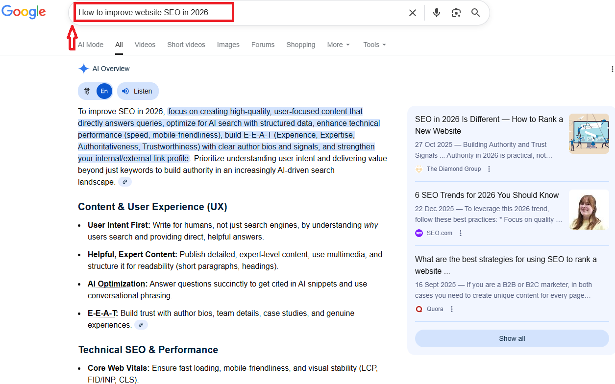For example, when a user searches “How to improve website SEO in 2026”, SGE may instantly show a summarized explanation of modern SEO practices, along with a few trusted source links.